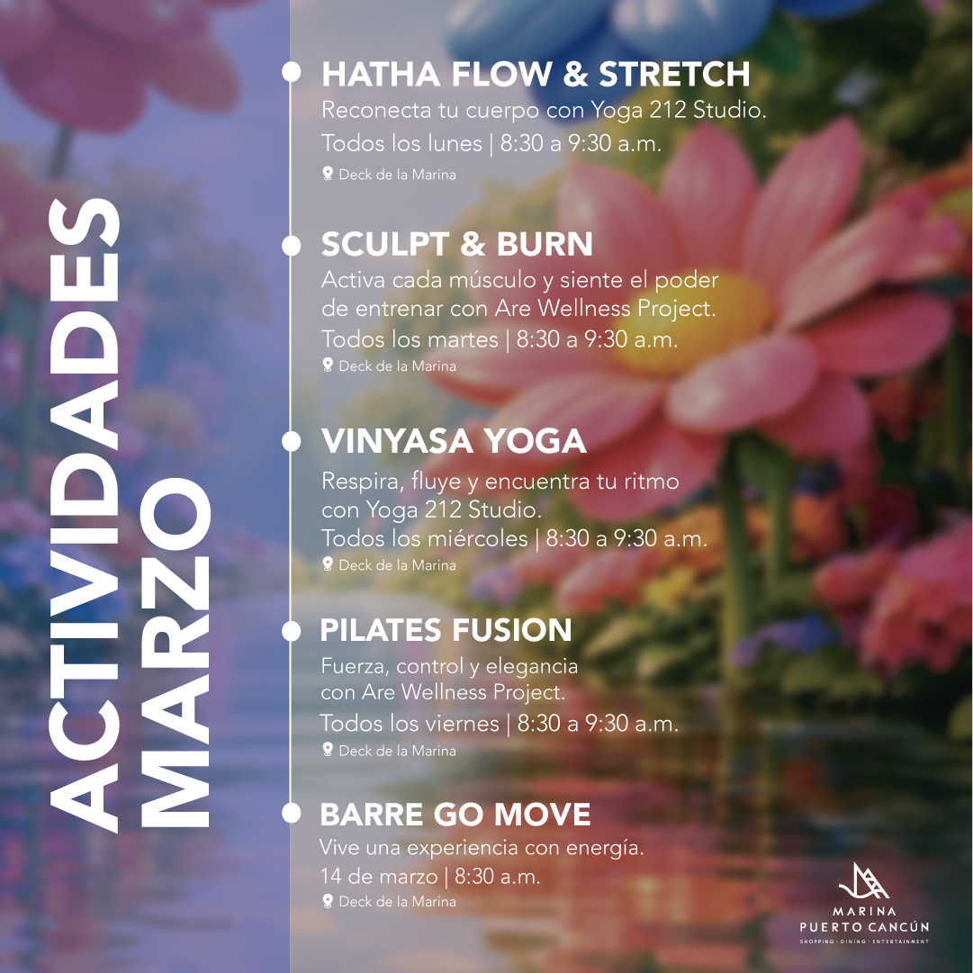 Promovemos tu bienestar con actividades wellness al aire libre, abiertas al público todos los días en horario matutino.